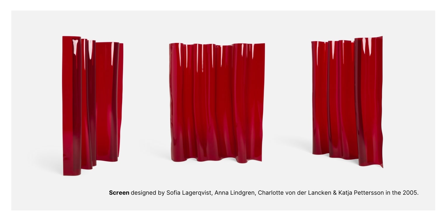 This moulded plastic screen by the Swedish design group Front is a contemporary twist on Finnish designer Alvar Aalto’s iconic 1936 room divider. Originally founded while the members were still studying at Konstfack University of Arts, Crafts and Design in Stockholm in the early 2000s, Front was originally a quartet. Today, the acclaimed group consists of Sofia Lagerqvist (b. 1972) and Anna Lindgren (b. 1974). The screen was designed in 2005 as a part of their first collection for the producer Materia.