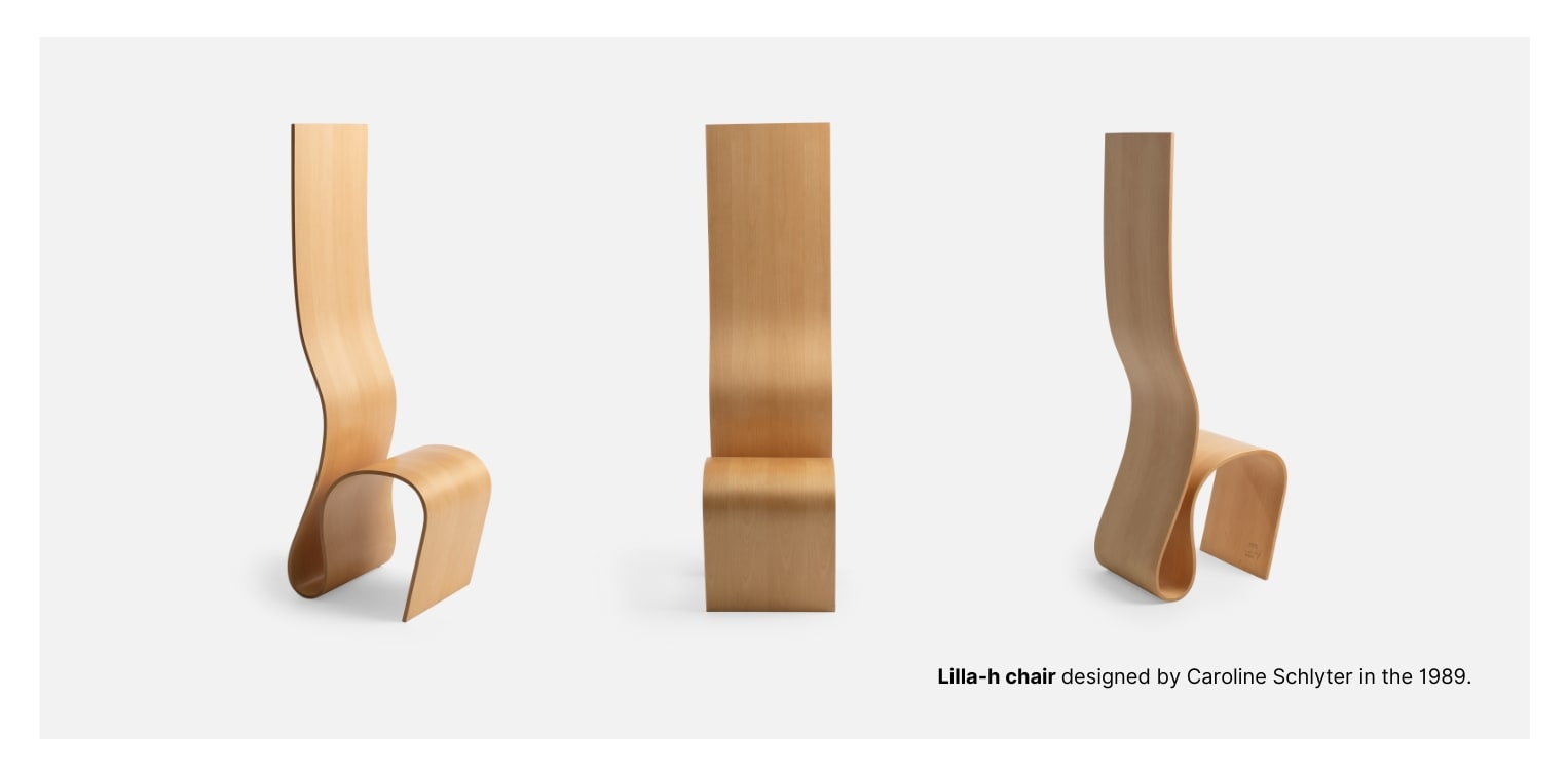 While still an art student at Konstfack University of Arts, Crafts and Design in Stockholm, Caroline Schlyter (b. 1961) created the Lilla-h (Little-h) chair for an exhibition at the Stockholm Furniture Fair in 1989. Made in a limited edition of 20 numbered and signed pieces, the sculptural laminated-wood chair belied its name by standing an impressive 150 centimetres tall. It was an immediate hit, winning awards and leading to exhibitions all over the world.